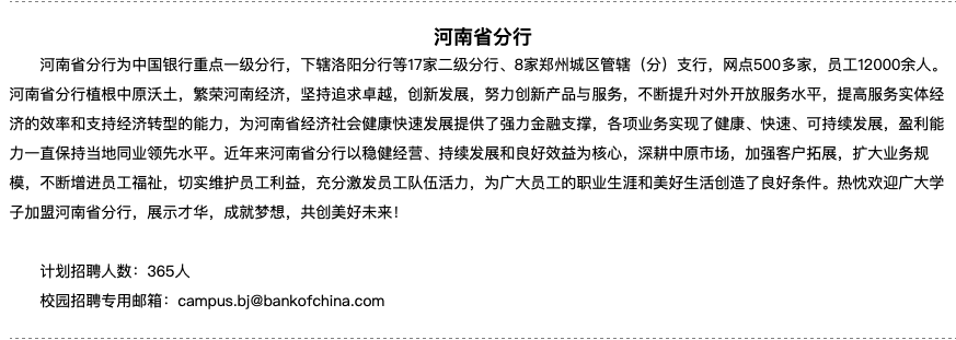 365人!中国银行河南省分行校园招聘公告